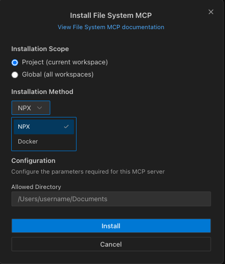 - Select an installation method (NPX or Docker)